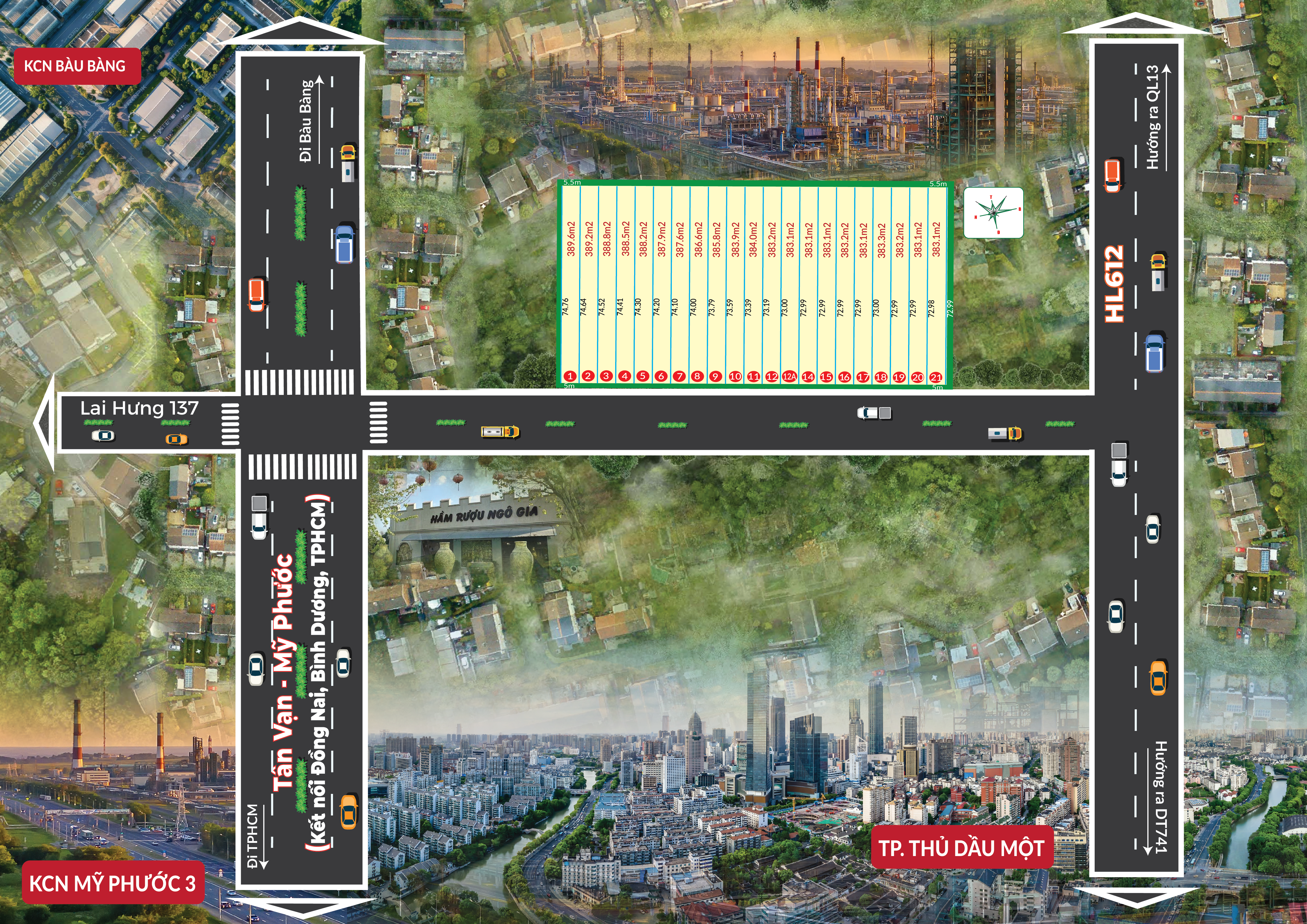 Khu dân cư Bến Cát nằm tọa lạc mặt tiền tuyến đường quy hoạch Nhà Nước 22m Lai Hưng 137 với 6 làn xe, vì nằm vị trí đắc địa nên khu dân cư Tp Bến Cát có rất nhiều tiềm năng khai thác cho thuê, nghỉ dưỡng, hoặc đầu tư sinh lời bởi đây là quy hoạch tuyến đường trọng yếu trung tâm kết nối Bình Dương với các tỉnh Tp. Hồ Chí Minh, Đồng Nai, Bình Phước và các tỉnh Tây Nguyên.